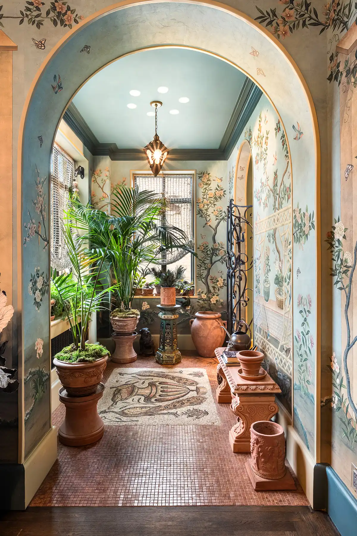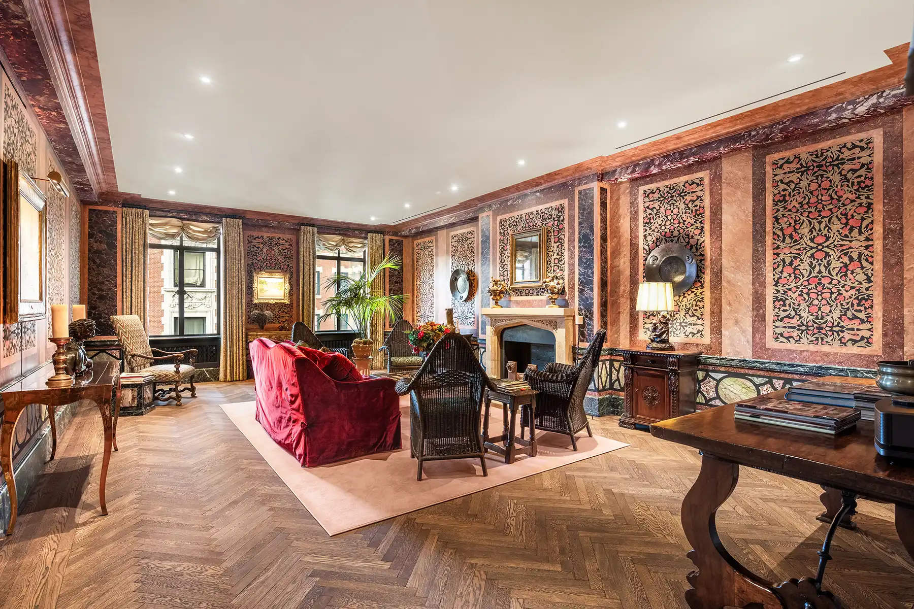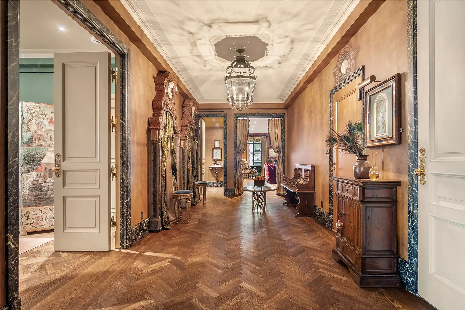 The living room feels both expansive and intimate, framed by perfectly restored plaster moldings and original herringbone floors in flawless condition. Bathed in southern and western light, the elegant formal dining room captures breathtaking sunset views over the Upper West Side’s storied townhouses. An adjoining sunroom showcases a museum-worthy 3rd century A.D. mosaic, set into the floor—a true conversation piece and a testament to the apartment’s artistry. Together, these rooms evoke the romance and refinement of Old-World Europe, creating an atmosphere at once opulent and inviting.