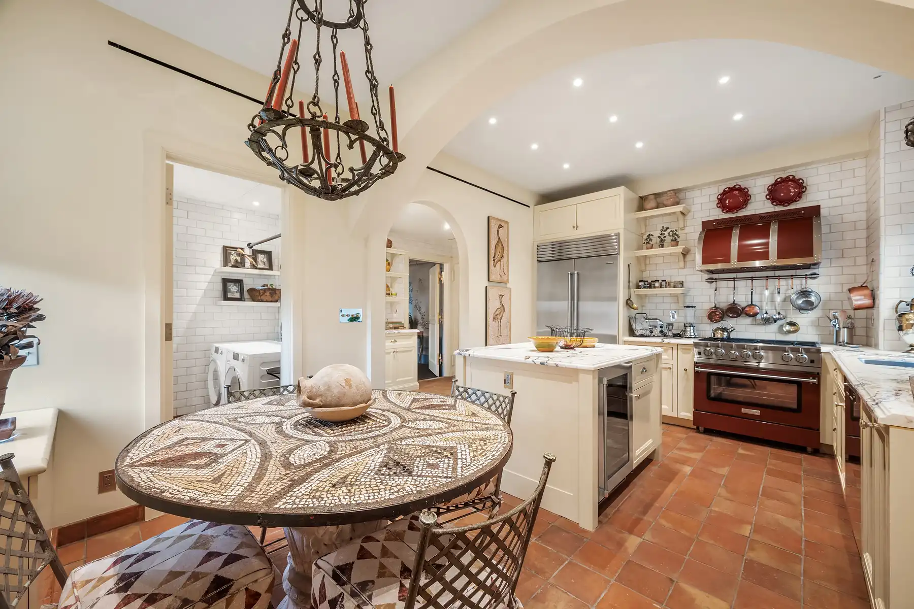 The large, eat-in chef’s kitchen combines modern luxury with classic craftsmanship. Outfitted with custom cabinetry, top-of-the-line appliances, radiant heated floors, and a full butler’s pantry, it is designed for both effortless entertaining and everyday comfort. There is a powder room off the kitchen, complete with a full-sized washer and dryer.